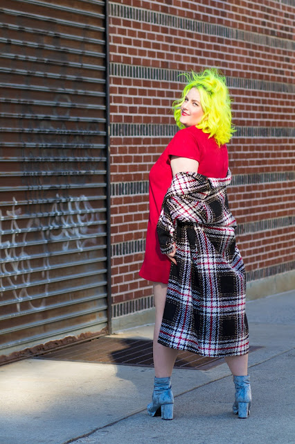 For anyone going on vacay to NYC my trip essentials definitely include a bold shift dress (this one has pockets OMG!) and lightweight midi coat. I'm obsessed with these velvet booties because they are a bold texture and the platform heel is perfect for long time wear.
